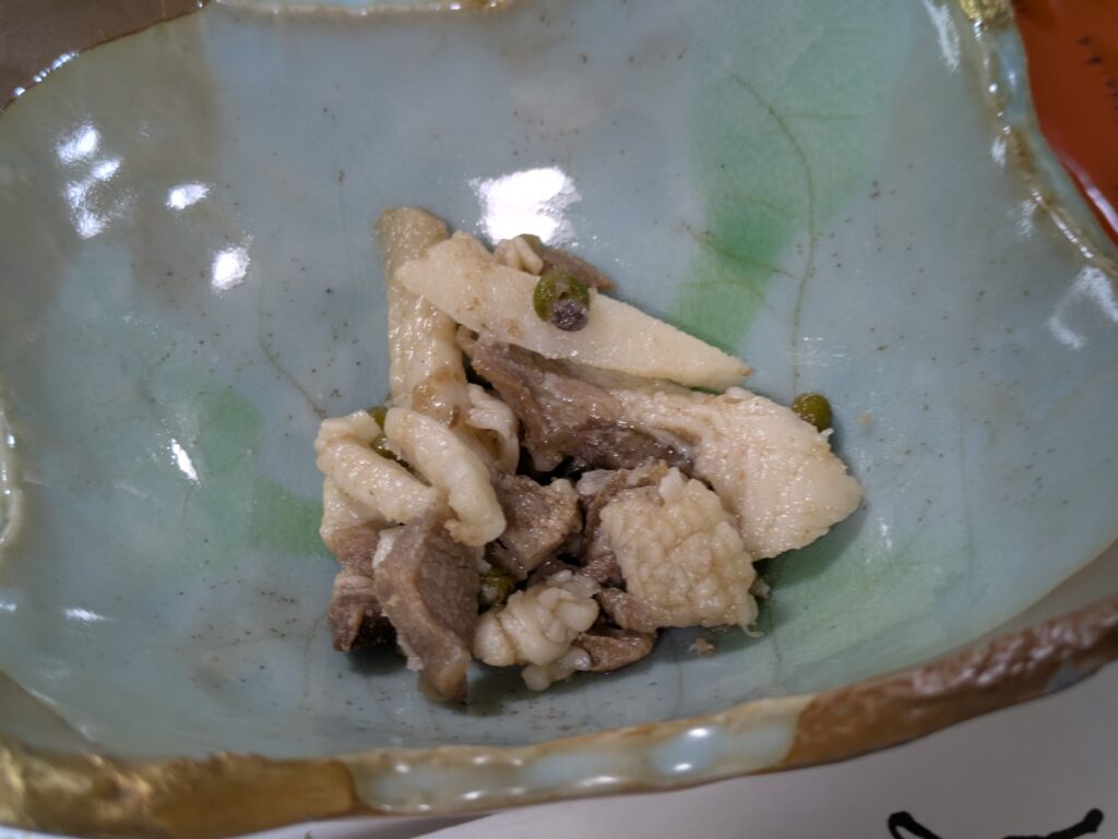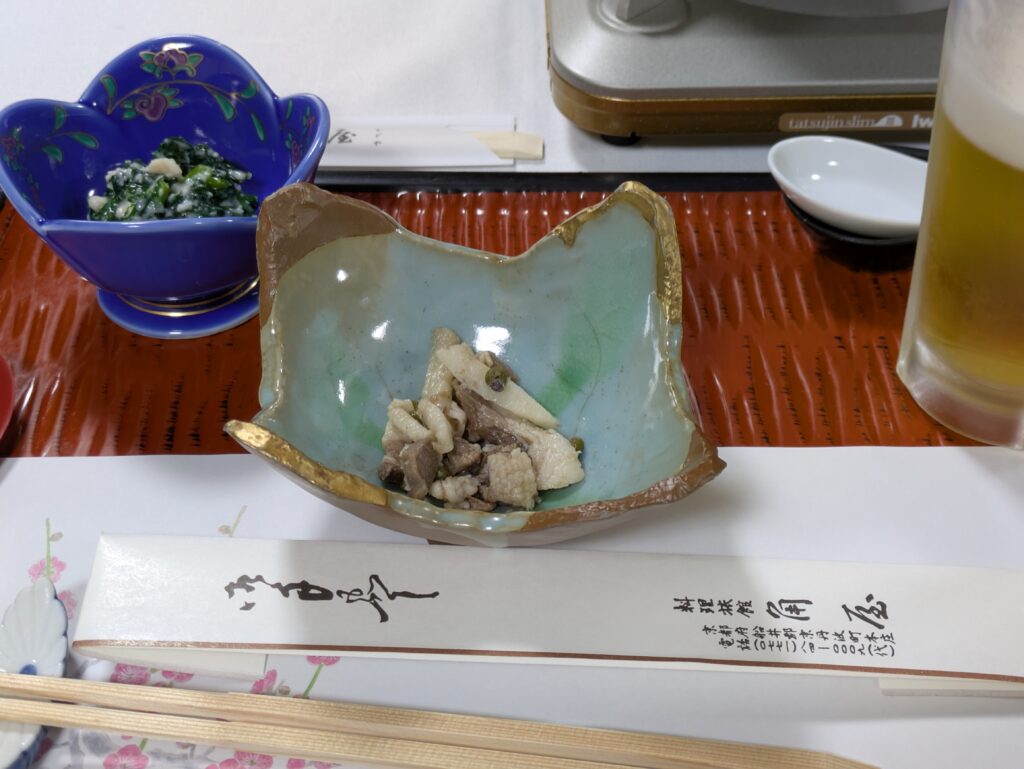 突き出しは野菜嫌いな私も美味しく頂けた、なんかの白和と猪の内臓料理
